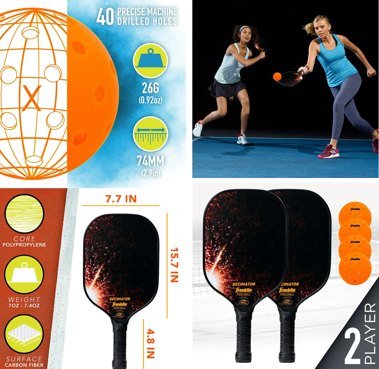 Bộ vợt pickleball dành cho hai người này bao gồm (2) vợt pickleball sợi carbon Decimator và (4) bóng pickleball ngoài trời X-40 để bạn có mọi thứ cần thiết để ra sân.