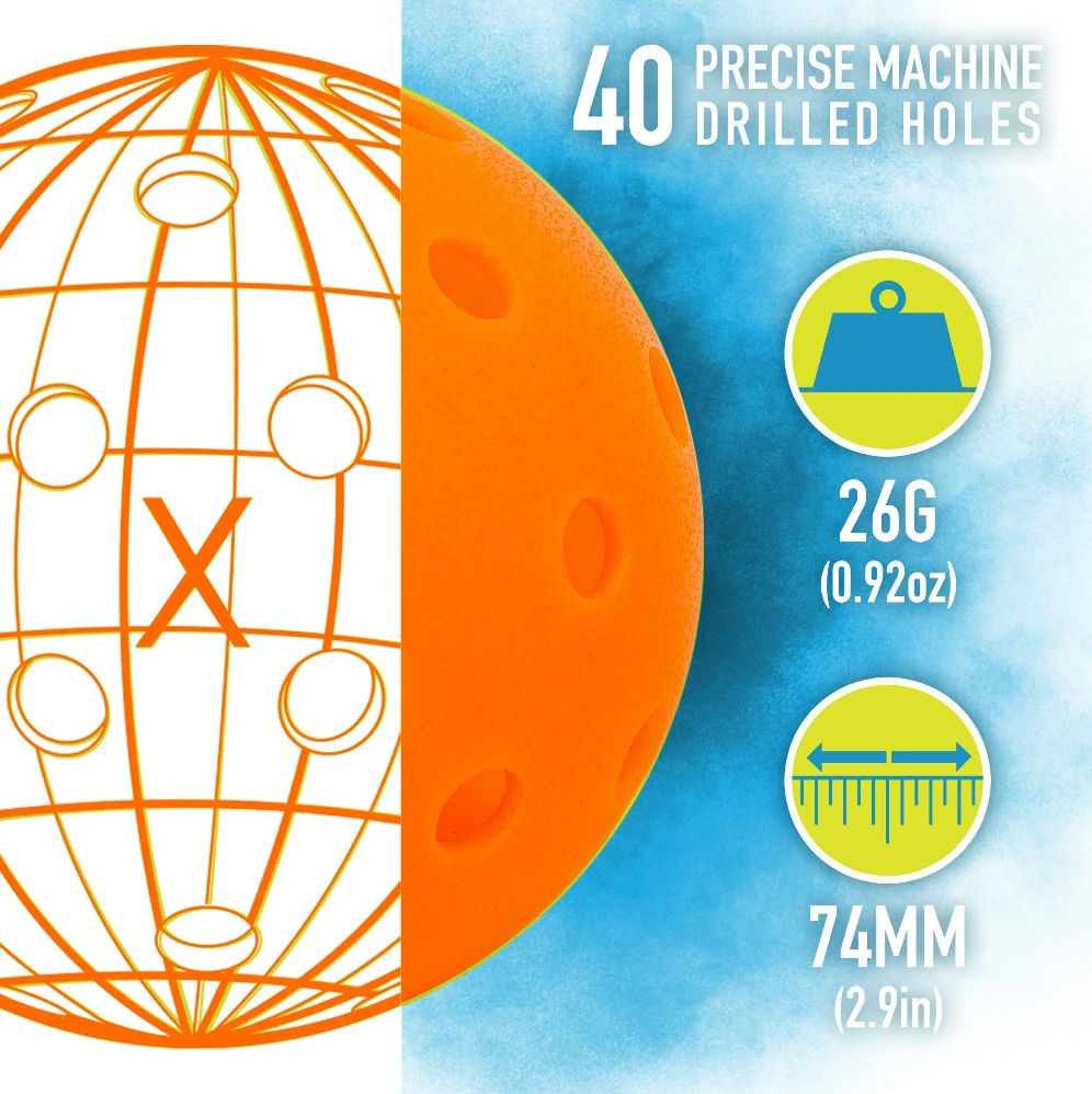 ?Bóng X-40: Bộ sản phẩm bao gồm bóng X-40, là loại bóng chính thức của USA Pickleball, được thiết kế để chơi ngoài trời cao cấp trên mọi bề mặt sân.