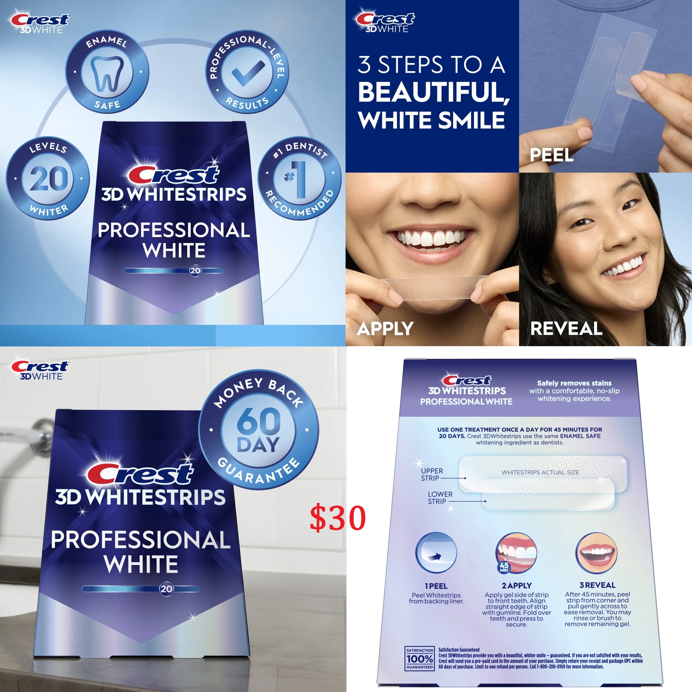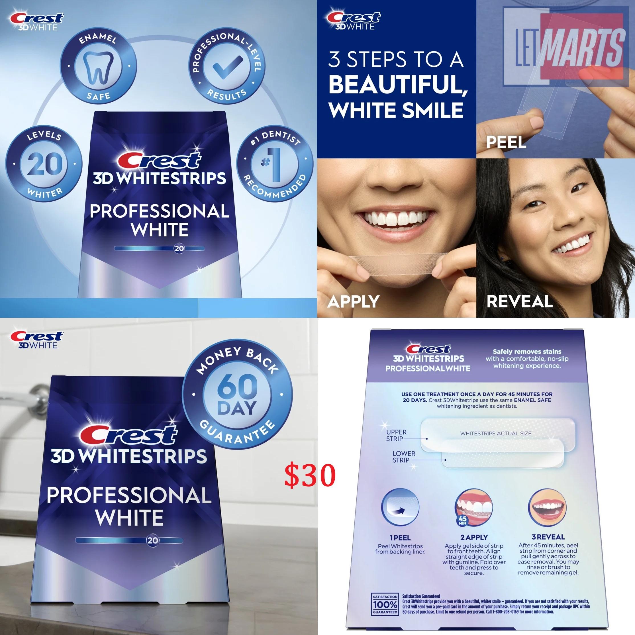 #Crest3D #Whitestrips #ProfessionalWhite là bộ dụng cụ làm trắng răng tại nhà, giúp loại bỏ hơn 15 năm vết ố vàng và làm răng trắng hơn 20 lần. Sản phẩm sử dụng cùng thành phần làm trắng an toàn như nha sĩ và an toàn cho men răng. Bộ sản phẩm bao gồm 40 miếng dán cho liệu trình 20 ngày, với 20 miếng dán cho hàm trên và 20 miếng dán cho hàm dưới. Mỗi lần dán kéo dài 45 phút. Miếng dán có độ bám chống trượt, cho phép bạn nói chuyện và uống nước trong khi sử dụng.