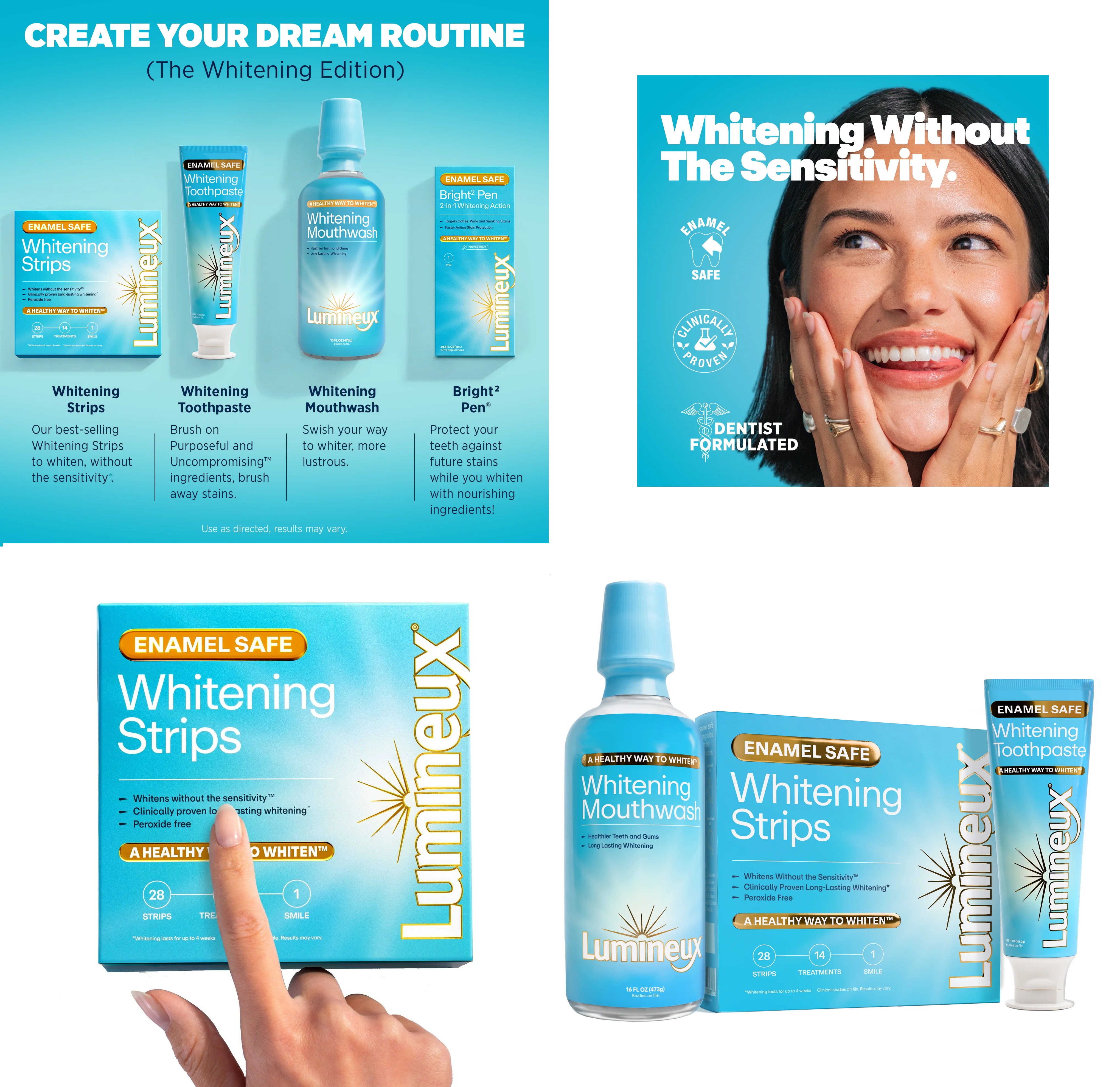 Các sản phẩm được tạo ra bởi một trong những nha sĩ hàng đầu Hoa Kỳ, được chứng minh lâm sàng là hiệu quả mà không cần sử dụng thuốc tẩy trắng mạnh.