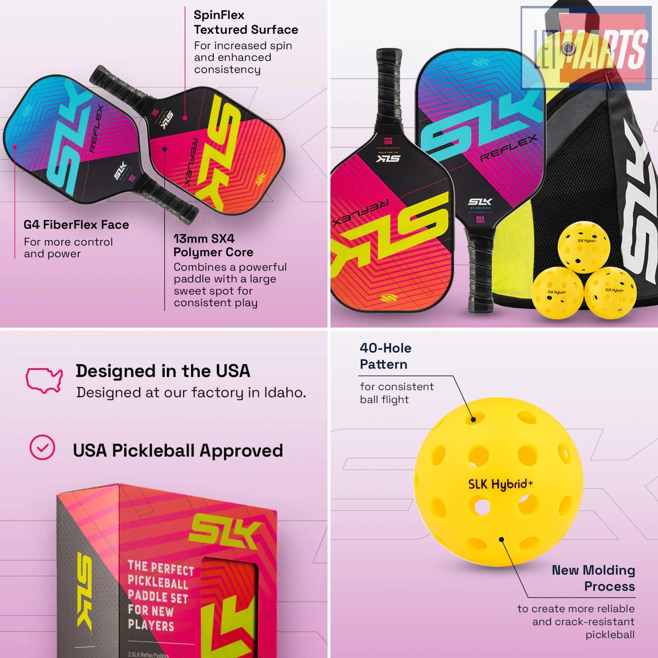 Hoàn toàn tuân thủ tất cả các yêu cầu của USAPA cho các giải đấu, bộ vợt SLK Reflex Bundle là bộ vợt được lựa chọn hàng đầu cho những người chơi mới bắt đầu chơi pickleball.
