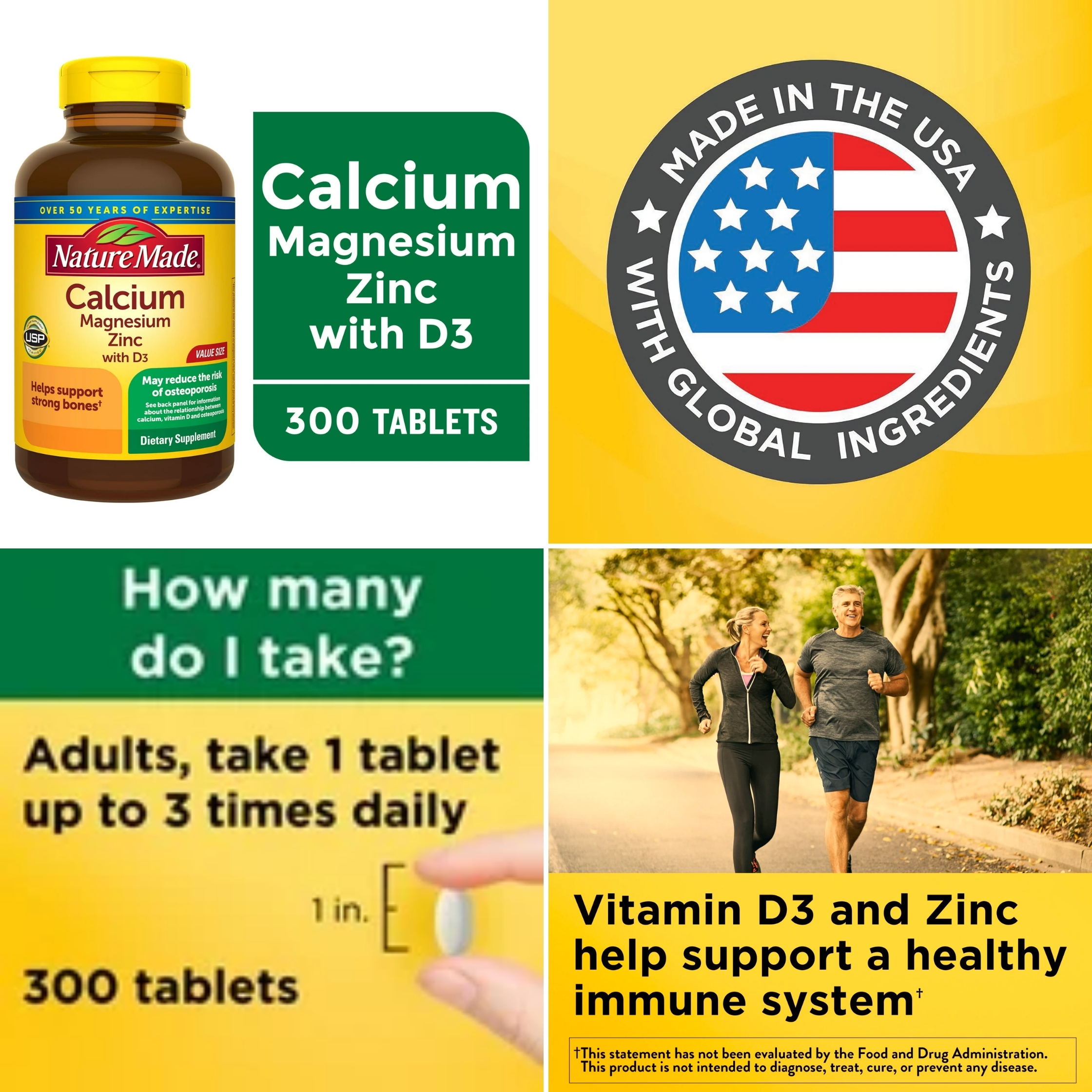 Thực phẩm bổ sung Canxi Magie Kẽm với Vitamin D3 của Nature Made hỗ trợ xương chắc khỏe. Được làm từ các thành phần chất lượng cao, thực phẩm bổ sung Canxi không chứa gluten này là một loại thực phẩm chức năng không chứa chất tạo màu tổng hợp và không có hương vị nhân tạo. Những viên nén Canxi Magie Kẽm này cũng giúp bạn đáp ứng nhu cầu Canxi hàng ngày và bao gồm Vitamin D3, giúp cải thiện sự hấp thụ Canxi. Vitamin D3 và Kẽm hỗ trợ hệ miễn dịch. Magie hỗ trợ thư giãn cơ bắp, sức khỏe thần kinh, tim mạch và xương. Kẽm rất cần thiết cho sự tăng trưởng và phát triển bình thường. Đối với những người không nhận đủ Canxi trong chế độ ăn uống, thực phẩm bổ sung Canxi Magie Kẽm D3 này có thể giúp ích. Người lớn uống một viên bổ sung Canxi Magie Kẽm tối đa ba lần mỗi ngày với nước và bữa ăn. Thực phẩm bổ sung Canxi của Nature Made là chất lượng bạn có thể tin tưởng.